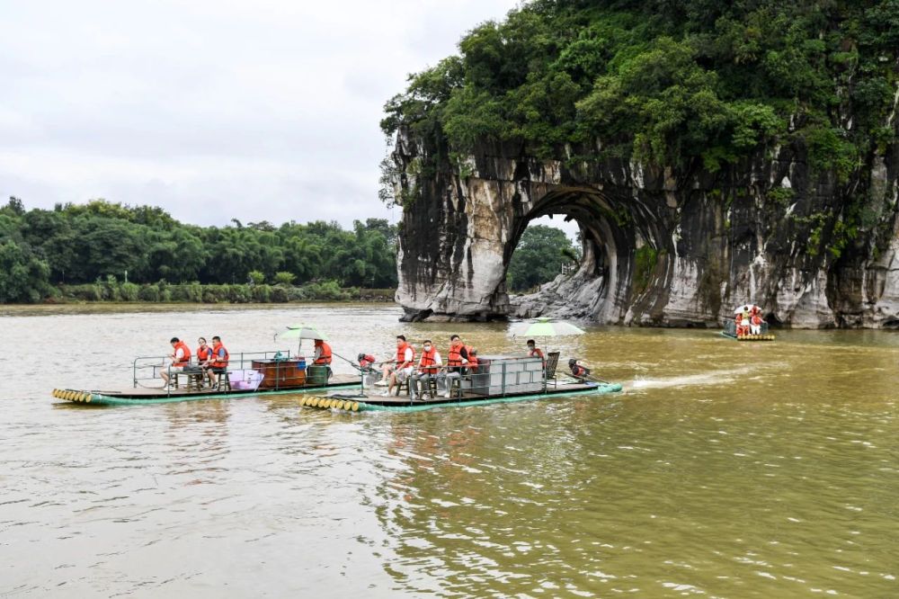 游客在广西桂林乘坐竹筏游览象鼻山(2022年6月29日摄) 曹?铭摄/本刊