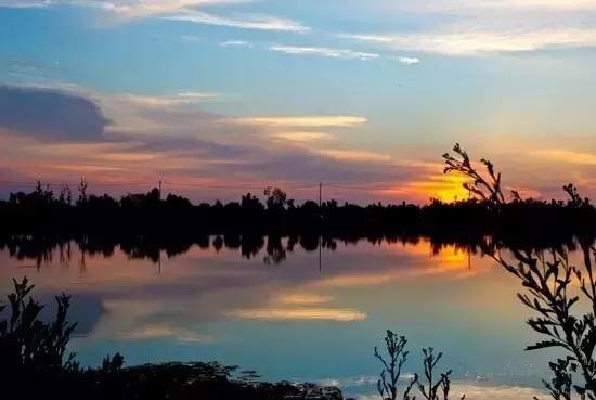 植被资源比较丰富,水生植物主要以芦苇、香蒲为主,植被覆盖率达48%。暮色降临,夕阳的余晖染红天际,漫天霞光映衬湿地,斑斓色彩如影随形。