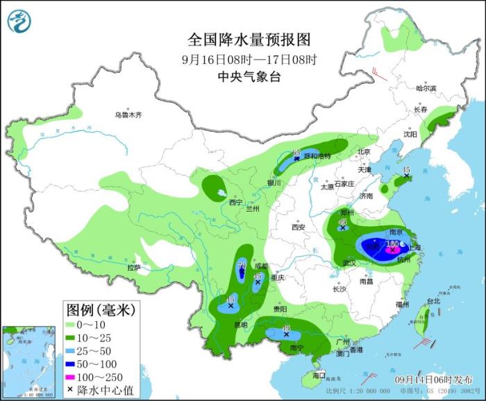 9月16日08时至17日08时,内蒙古中西部、河南中东部、湖北中东部、安徽中南部、江苏中南部、上海、浙江中北部、四川盆地西部和南部、云南中东部、广西、广东西南部、台湾岛东部等地部分地区有中到大雨,其中,内蒙古河套地区、安徽中南部、江苏南部、浙江北部、四川盆地西南部等地部分地区有暴雨或大暴雨(100~160毫米)。内蒙古东北部部分地区有4~5级风。