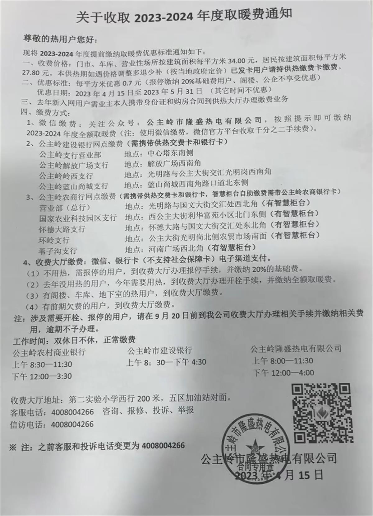 对此,公主岭市隆盛热电有限公司的客服表示,这份通知确实是公司发的,4月15日就可以开始缴费,想什么时间缴费都可以,在供热之前交就行,按通知时间提前交有优惠。