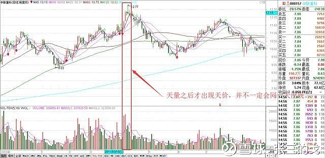 天量天价则是指个股放出了巨量,股价也处于高位。这是量增价涨的极端情况。这意味着股价基本是处于上涨的末期,说明市场极度疯狂。有人卖,同时也有人大量接盘,多数情况是属于不理性的抢购筹码。天量之后,市场会恢复理性,股价就可能会下跌,进入调整阶段。例如图中中联重科在创天量之后,伴随而来的天价,当然天量天价也有可能同时出现。在见到这类情况的时候,小散最好多回避。但是也存在着回调之后,股价继续创新高的情况。