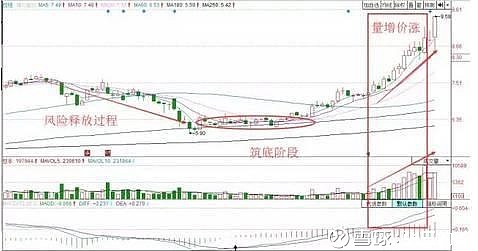 从上图中的神火股份 (000933),大家其实不难发现:神火股份经过前期大幅度杀跌,风险得到极大释放,进入横盘筑底阶段。市场信心逐步企稳回升,开始有资金介入抄底。随着成交量的放大和股价的同步上升,主力不断消化空头力量,最终达到高度控盘,股价拉升在即。因此,当股价出现量增价涨的现象时,也是一个不错的买点。