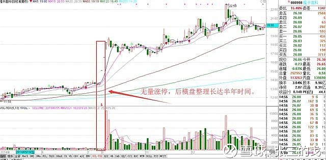 无量涨停是指个股的成交量很少,股价却出现涨停。它是量缩价涨的一种极端情形。这说明出现巨大的封单,而且基本没有抛压。一般来说,这种情况可能会出现在重大利好的情形,特别是中小盘股,主力比较偏好。例如隆平高科在获得中信集团入主的情况,复牌后就出现了无量涨停。