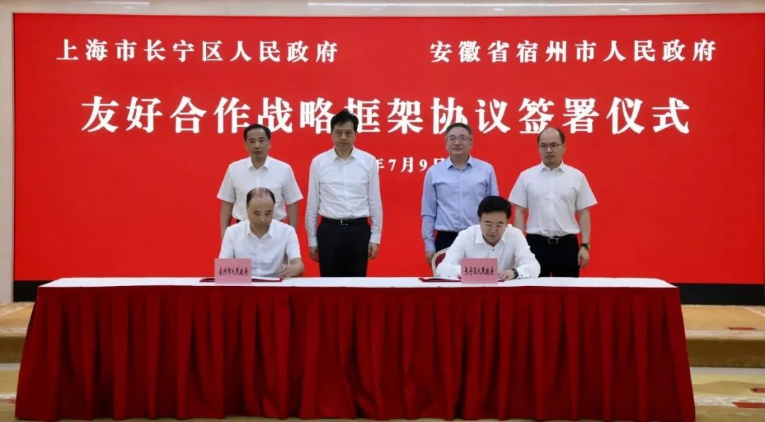 7月8日,长宁区与安徽省宿州市举行合作交流座谈会暨签约仪式,共同深化区域合作,携手助力长三角一体化发展。长宁区委书记张伟、宿州市委书记杨军出席会议。