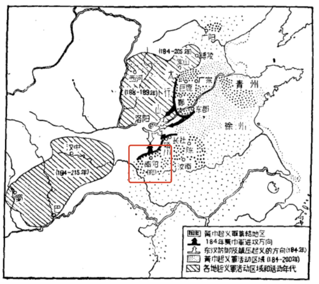 黄巾起义形势及南阳郡位置示意。来源/《中国简史》,天津师范学院历史系《中国简史》编写组编,北京:人民教育出版社 , 1979年
