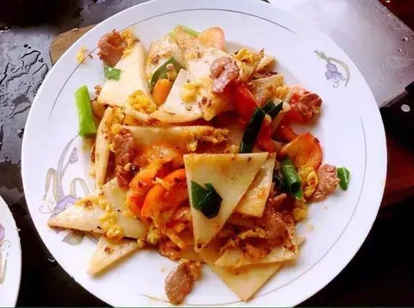 “大救驾”是保山腾冲的名小吃,先将饵块卷切成三角形的小片,加入火腿片、鲜肉片、鸡蛋、胡萝卜、西红柿和豌豆尖等,放入旺火的锅中爆炒,起锅前加入香料。色泽金黄,油而不腻,口感很好。