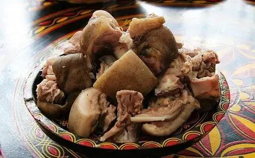 坨坨肉是楚雄、迪庆等地彝族人饮食文化中很具代表性的一道菜。彝语称“乌色色脚”,意思是猪肉块。这道菜的做法是将猪肉或羊、牛肉砍好,用热水煮熟,肉熟后捞起,配以蒜水、盐及花椒等即可食用。吃起来肥而不腻,越嚼越香。
