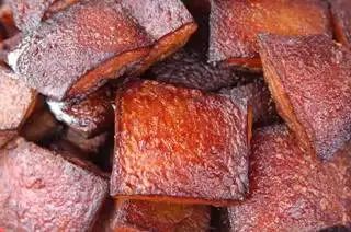 曲靖当地农家风味的五花肉黑皮子,其色泽棕红发亮,味道肥而不腻。在大年小节的日子里,曲靖“八大碗”中的酥肉、丸子、黑皮子是必不可少的三大美食。