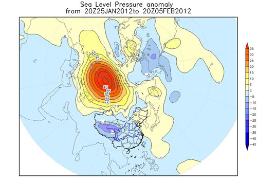 图2 2012年1月25日-2月5日海平面气压场距平分布图(单位:百帕)