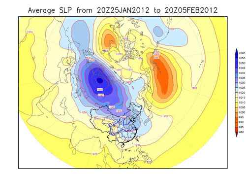 图1 2012年1月25日-2月5日海平面气压平均场分布图(单位:百帕)