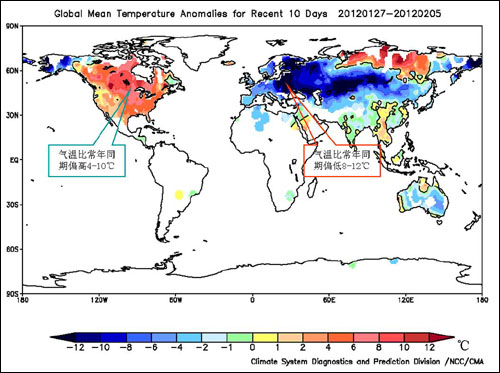 图4 2012年1月27日-2月5日全球气温距平图(单位:℃)