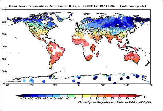 图5 2012年1月27日-2月5日全球平均气温分布图(单位:℃)
