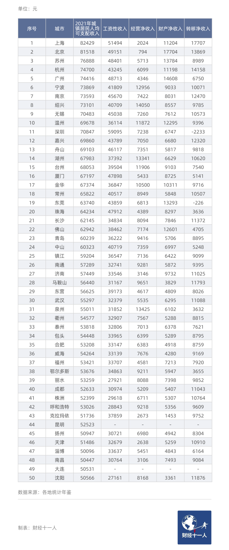 一般来讲,居民可支配收入按照收入来源可分为四项,分别为工资性收入、经营净收入、财产净收入和转移净收入。因为2022年很多城市的分项数据尚未公布,下面就用最富50城2021年的数据来进行分析。