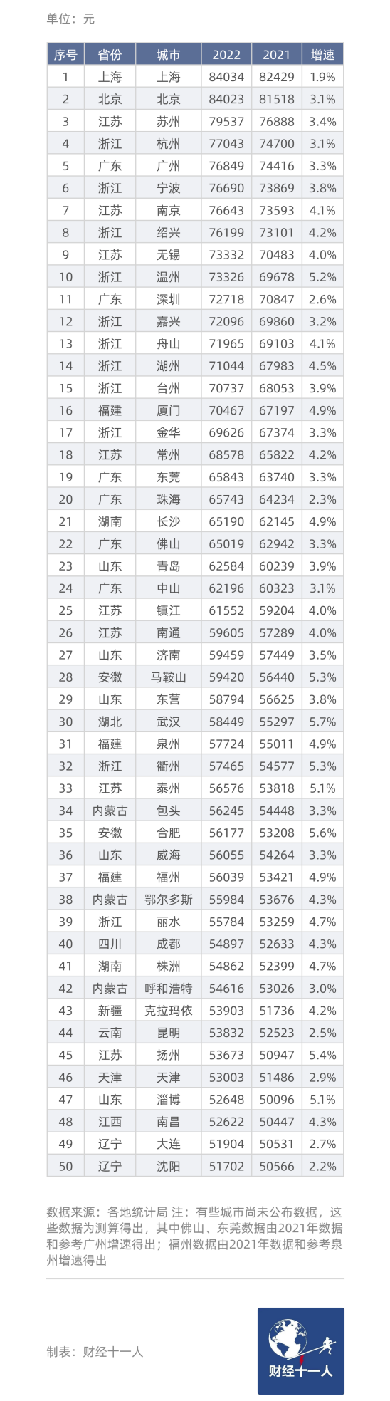 表1: 中国地级以上城市城镇居民人均可支配收入50强
