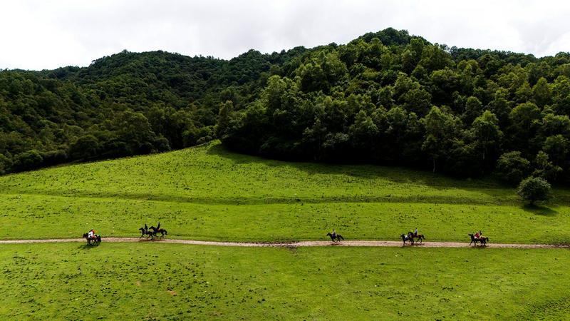 8月3日,游客在关山草原景区的一处马场骑马(无人机照片)。