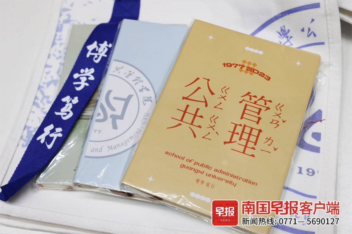 各学院都准备了心意满满的新生礼包。新闻与传播学院的新生礼包,除了有实用的校园安全手册,还有精美的文创手提袋、西大校徽、校园卡卡套,就连学院专属院服都安排上了。公共管理学院更是贴心,礼包里有扇子,以及学长学姐亲手设计的笔记本,封面不仅有中文的公共管理学院字样,还融入了壮文元素,创意十足。