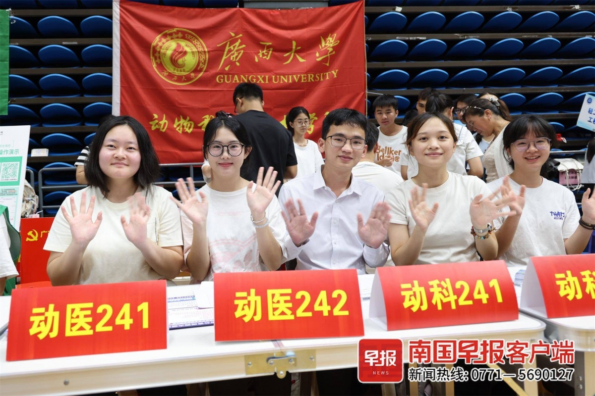 ▲广西大学动物科学技术学院的学长学姐们欢迎新生报到。记者 邹财麟 摄