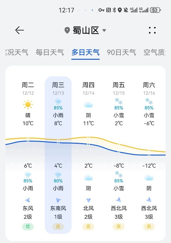大皖新闻讯 12月6日,不少合肥市民注意到,手机自带的天气预报显示12月16日合肥市最低气温将下降到零下12℃,甚至最高温度也只有零下6℃。市民吴女士告诉记者:“昨天看还是零下10℃,今早一看又降两度。”