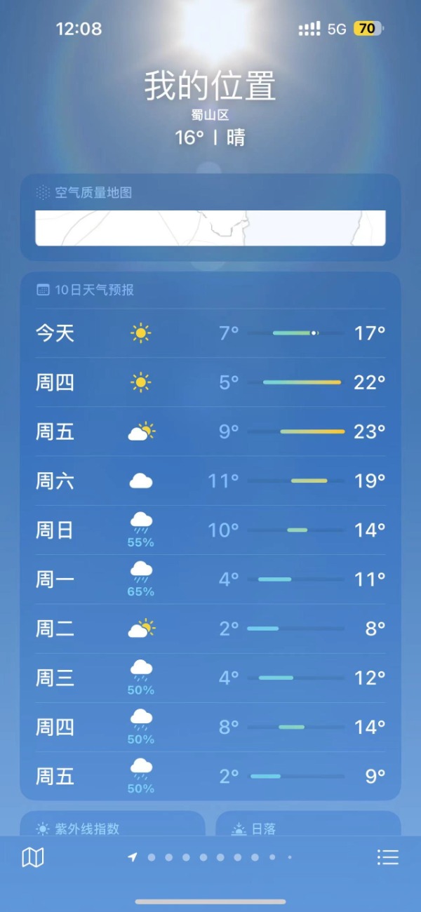 大皖新闻记者还注意到,不同手机系统预报的天气差别还不小。12月6日中午12点左右,记者分别用安卓系统手机和苹果系统手机查询了下周天气。安卓系统手机显示下周五(12月15日)天气预报为小雪,气温在-8℃~2℃,而苹果系统手机同天预报有降雨,气温在2℃~9℃。