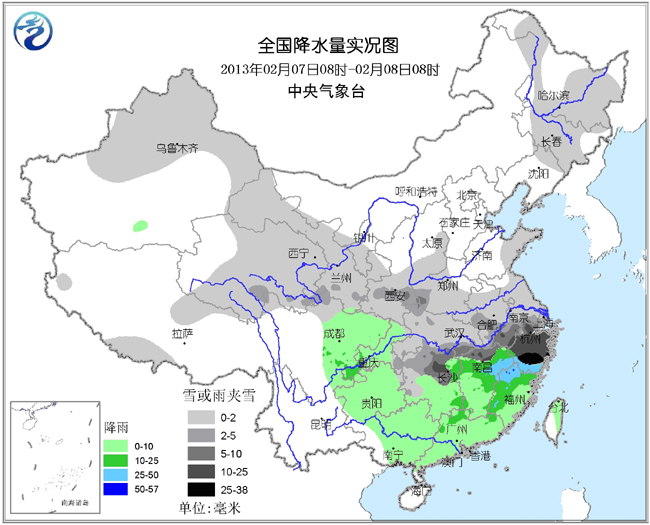 图1 全国降水量实况图(2013年2月7日08时至2月8日08时)
