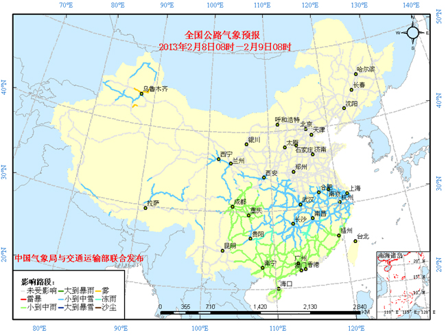 图3 全国公路气象预报(2013年2月8日08时至2月9日08时)
