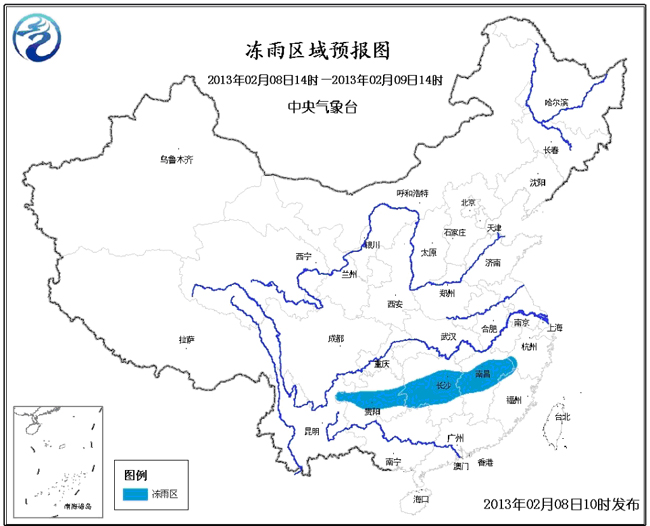图2 冻雨区域预报图(2013年2月8日14时至9日14时)