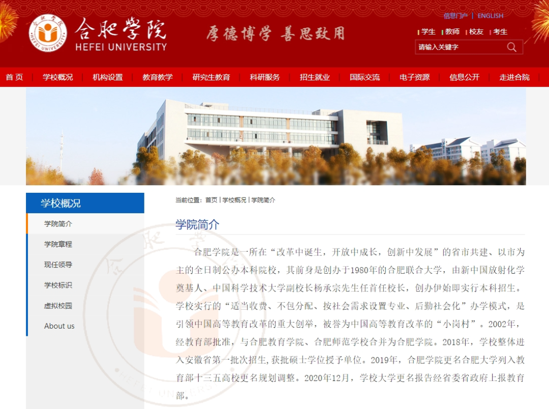 合肥学院官网的简介中写道,该校是一所在“改革中诞生,开放中成长,创新中发展”的省市共建、以市为主的全日制公办本科院校,其前身是创办于1980年的合肥联合大学。