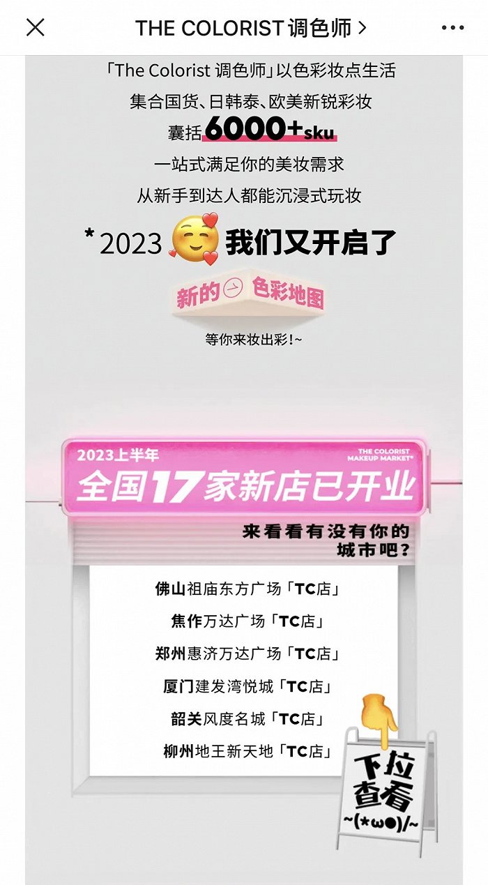 根据调色师公众号,美妆集合店调色师计划在全国持续开出100+门店,而今年上半年开出的17家门店大多数位于石河子、柳州、鞍山、金华、佛山、焦作等低线城市。