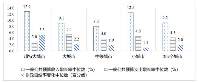 5.从财政自给率看,超大特大城市、大城市、中等城市、小城市平均财政自给率分别为79.2%、59.4%、46.0%、30.5%,分别增长5.9、3.4、2.4、2.7个百分点,超大特大城市财政自给率提升最多(图2)。
