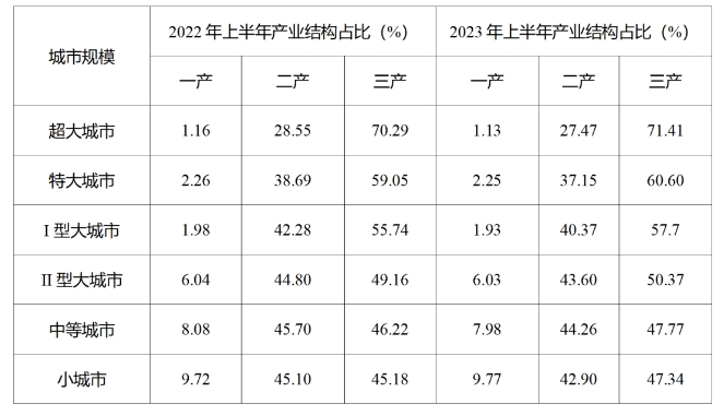 2023年上半年,97%的城市国内生产总值(GDP)实现同比增长,跑赢同期全国GDP增速(5.5%)的城市有138个;GDP超5000亿元的城市有24个,与2022年“万亿俱乐部”城市数量持平;成都成为第7个半年GDP超1万亿元的城市。从三次产业结构看,不同规模城市三产增加值占GDP比重均有提高,二产增加值占比均下降(表1)。