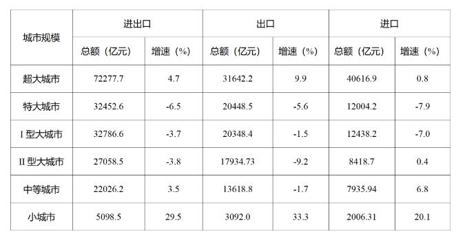 4.从进出口看,超大城市进出口总额72277.7亿元,是特大城市和I型大城市的2倍多,是II型大城市的约2.6倍,是中等城市的3倍多(表2);同时,外贸城市主导地位突出,进口、出口总额50强城市中,外贸依存度超过10%的城市分别有33个、34个。