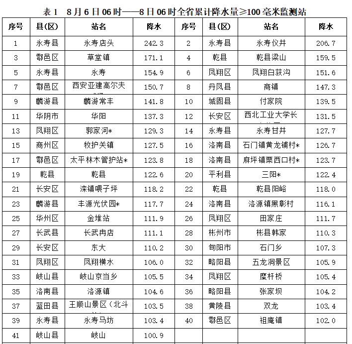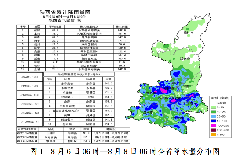 8月6日06时——8日06时全省共有104个区县1702个监测站出现降水 ,较大降水量位于宝鸡东部、咸阳西部、西安南部、延安西南部、渭南南部、商洛北部、汉中北部、安康南部等地,最大降水量永寿店头242.3毫米 ;共41站累计降水超过100毫米,291站累计降水超过50毫米,668站累计降水超过25毫米,1115站累计降水超过10毫米。西安站5.2毫米,城区最大75.5毫米(西安高新一中国际部)。