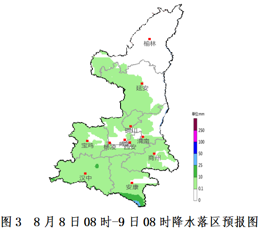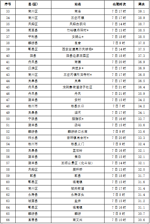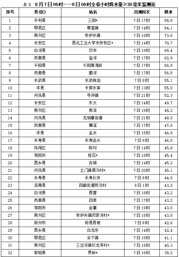 8月7日06时——8日06时全省小时雨强大于等于10毫米共619站次,小时雨强大于等于20毫米共192站次,小时雨强大于等于30毫米共68站次,最大平利县三阳7日17时雨强为98.9毫米。