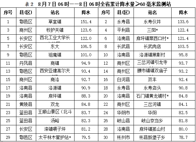 8月7日06时——8日06时全省共有103个区县1604个监测站出现降水,最大鄠邑草堂镇151.4毫米,其中9站大暴雨,106站暴雨,224站大雨,356站中雨,909站小雨 。西安站5.1毫米,城区最大17.1毫米(西安电子科技大学体育馆)。