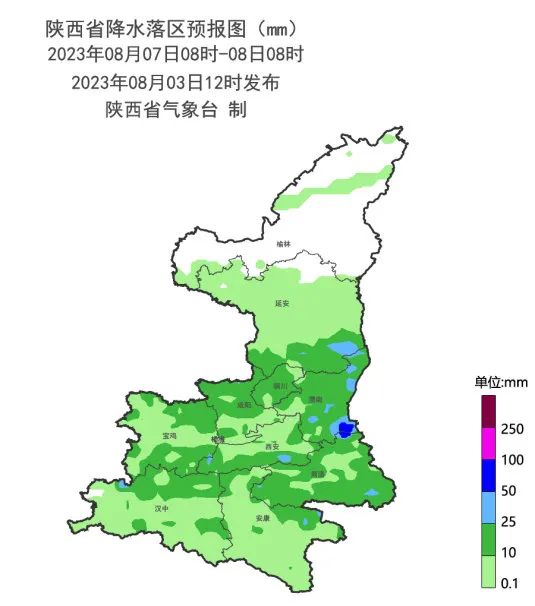 7日白天到夜间: 陕北中南部、关中、陕南大部有小到中雨或阵雨,关中东部局地和陕南东部局地有暴雨,降雨时伴有短时暴雨或7级以上雷暴大风。