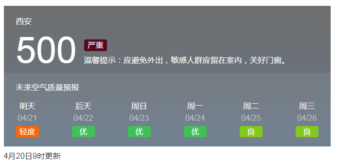 21日:西安、宝鸡、咸阳、渭南空气污染气象条件3级,其他地区较好,2级。