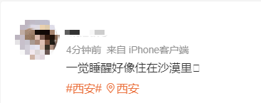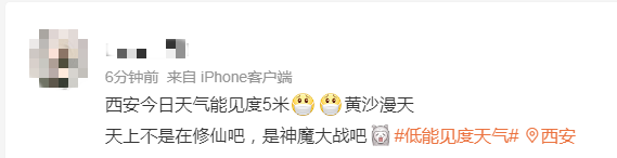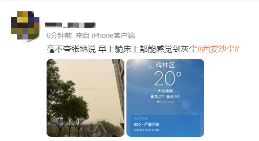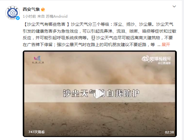 今天白天西安以扬沙天气为主,晚上降为浮尘。西安气象提醒:沙尘天气分三个等级:浮尘、扬沙、沙尘暴。沙尘天气引发的健康危害多为急性效应,可以引起流鼻涕、流泪、咳嗽、咯痰等症状和过敏反应,并可能引起呼吸系统疾病等。沙尘天气应尽可能远离高大建筑物,不要在广告牌下停留;强沙尘暴天气时在路上的司机朋友建议不要赶路,等狂风过后再行驶。