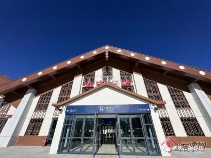 香格里拉站,以“层峦叠嶂的雪山”为设计理念,建筑整体造型设计灵感来源于巍峨壮丽的石卡雪山,两侧建筑部分如群山环抱,站房融合藏式建筑的木构件和檐口等元素,勾勒出“飞檐化彩云,户牖映霞光”的画面,藏式碉楼、边玛墙纹饰图样、梯形窗等藏式元素,被应用到建筑细部中,保持民族特色的同时,也展现了新的时代风貌。香格里拉站也是云南唯一安设了地暖的车站,后期将与当地供暖时间同步供暖。