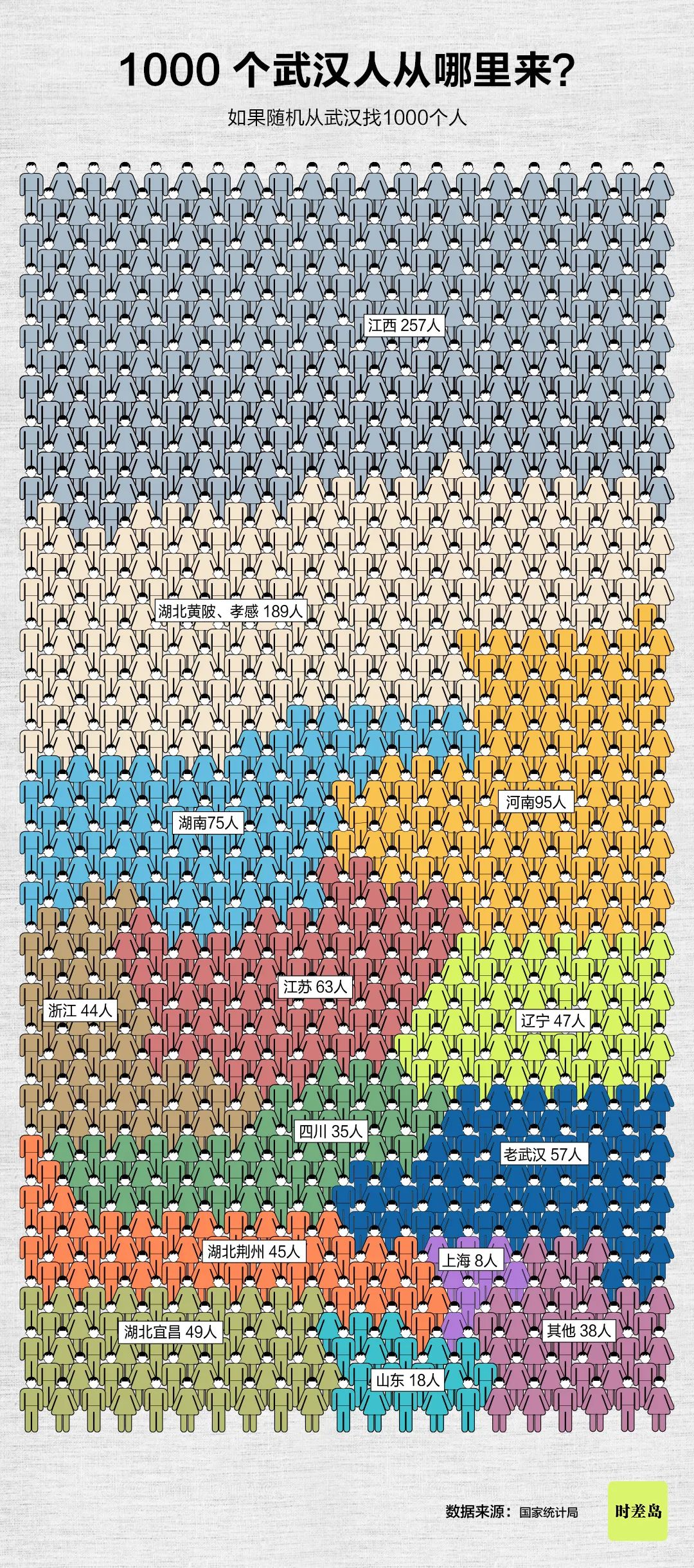 ▲ 1000个武汉人的祖籍大概率是35%江西人、20%湖北黄陂、孝感人;其次是江浙、湖南、河南、东北......东南西北各个方向都有。制图 贾世琪 | 时差岛