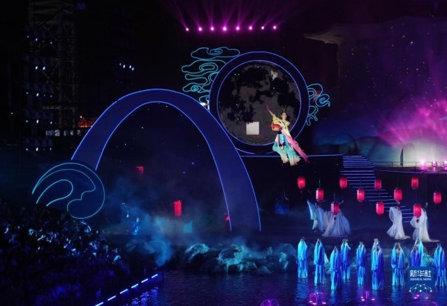 8月26日,演员在北戴河碧螺塔酒吧公园为游客表演大型实景秀《浪淘沙·北戴河》。