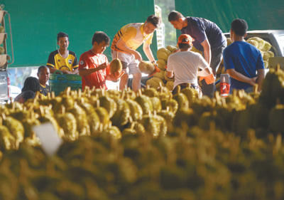 5月20日,在泰国庄他武里府,果农搬运新采摘的榴莲。今年以来,泰国水果对华出口额稳中有进。