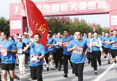 此次健康跑活动吸引了1200多名市直机关干部职工踊跃报名参赛。上午9时,随着一声令下,统一身着蓝色比赛服的干部职工从观峰大道起跑(见上图),沿着平坦宽阔的大道左拐进入旭东路,至龙翔大道丁字路口折返,右拐再回到起点观峰大道。广大干部职工在赛场上比拼争先,场下注重环保,展示了我市机关干部职工的精神面貌和文明形象。
