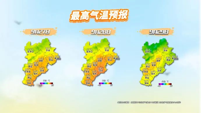 今天下午到夜间,张家口、承德西部、保定北部多云间阴有分散性阵雨或零星小雨,其他地区多云间晴。最高气温,张家口北部、承德北部14~18℃,其他地区19~29℃。最低气温,张家口北部、承德北部8~12℃,其他地区13~21℃。
