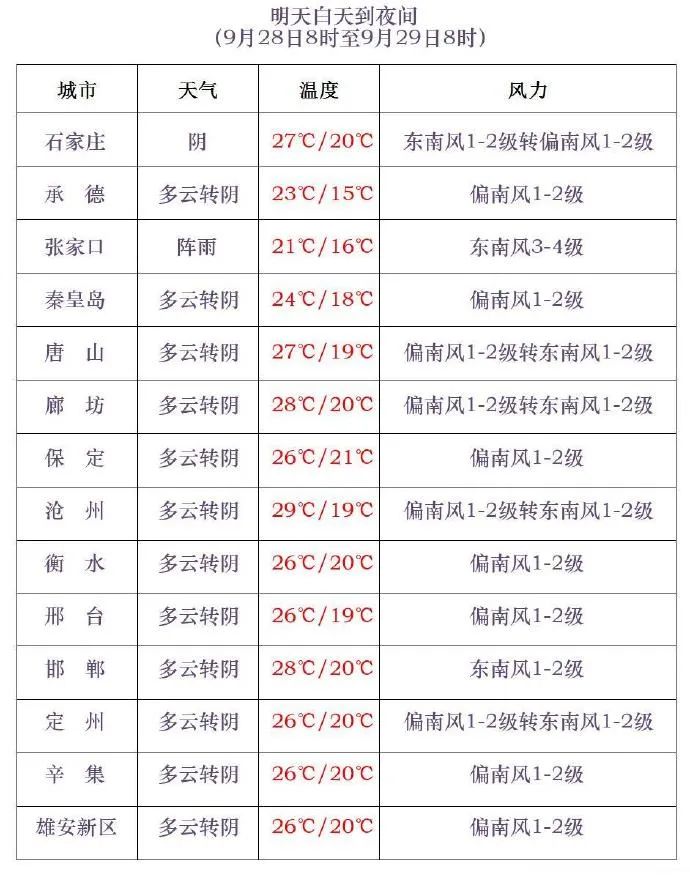 明天夜间到29日,全省阴,张家口、承德大部、保定、雄安新区、廊坊西部、石家庄西部、邢台西部、邯郸西部阴有小雨,其中张家口、承德西部局地有中雨。