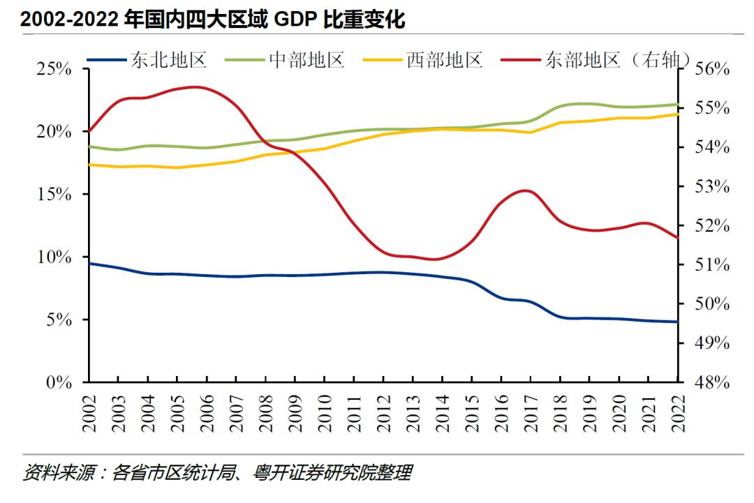 从2000年到2022年,中部、西部地区经济比重分别从20%、17%提高到22%、21%。