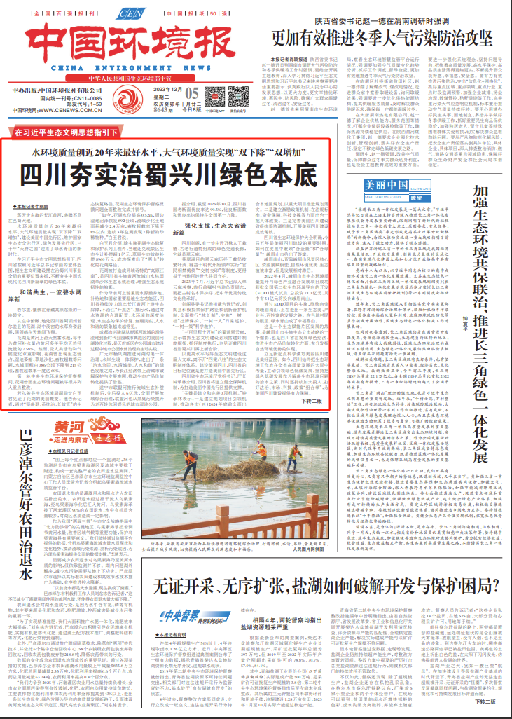 12月5日,《中国环境报》头版发表文章《水环境质量创近20年来最好水平,大气环境质量实现“双下降”“双增加” 四川夯实治蜀兴川绿色本底》,全文转载如下: