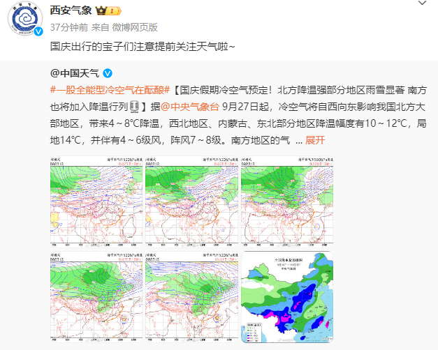 9月24日,据中央气象台,9月27日起,冷空气将自西向东影响我国北方大部地区,带来4~8℃降温,西北地区、内蒙古、东北部分地区降温幅度有10~12℃,局地14℃,并伴有4~6级风,阵风7~8级。南方地区的气温影响将略微滞后,在国庆假期期间有明显降温。