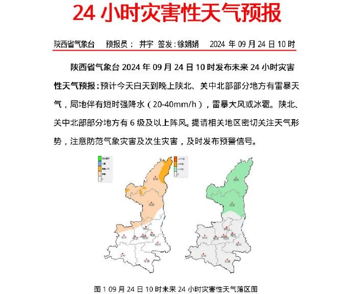 同时,陕西省气象台2024年9月24日10时发布未来24小时灾害性天气预报:预计今天白天到晚上陕北、关中北部部分地方有雷暴天气,局地伴有短时强降水(20-40mm/h),雷暴大风或冰雹。陕北、关中北部部分地方有6级及以上阵风。