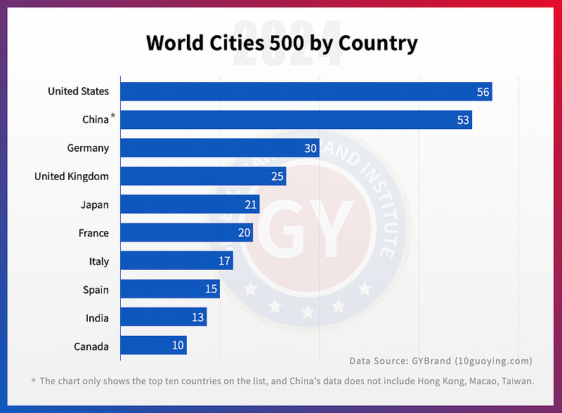 从各国入选数量来看,此次上榜的500个城市分布于139个国家。入选数量最多的十个国家依次是: