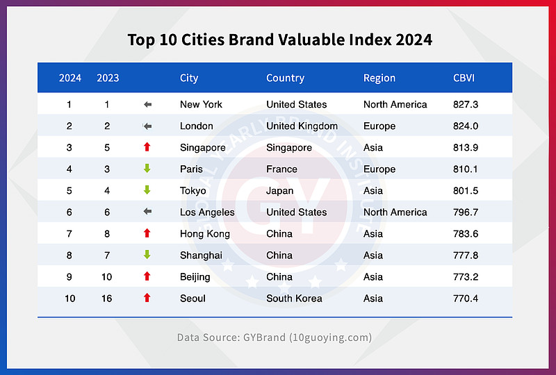 GYBrand发布的全球城市排名前十名单中,东亚、北美和西欧三大经济中心包揽10强。中国有3个城市入选,美国有2个城市入选,英国、法国、新加坡、日本、韩国各有1个城市上榜。东亚地区的中日韩合计6个城市上榜,成为了最大赢家。
